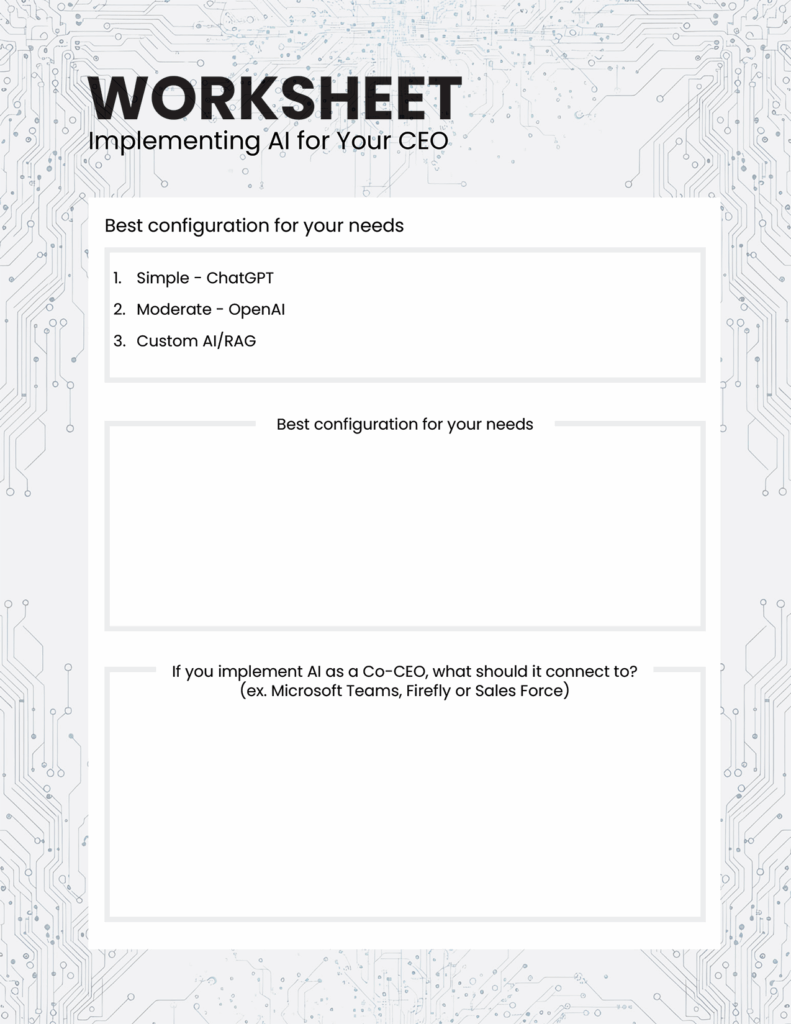 These tools are designed to help you think through the process of creating an AI environment that supports you as a CEO. Inside, you’ll find guided exercises that challenge you to:
